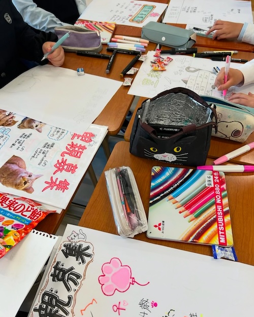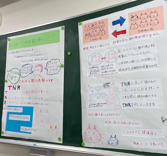 授業内容は、犬と猫の殺処分をなくすにはどうしたらいいかを、教員と生徒と外部講師である福岡県動物愛護センターの登録団体「猫糸舎」のTamaさんと共に学んでいます。