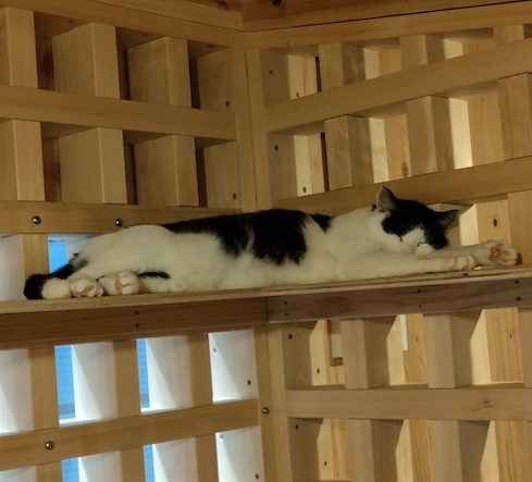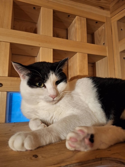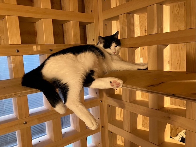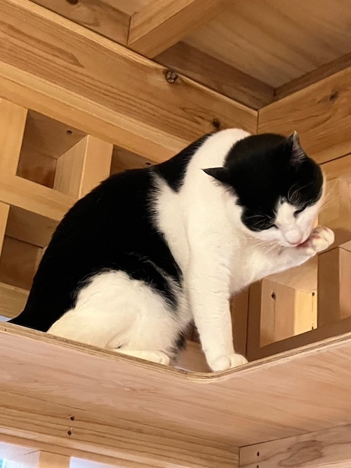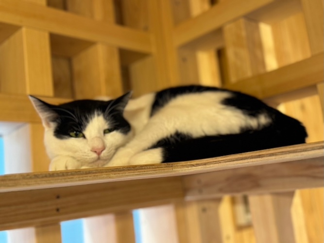 性格は社交的ですが、初対面の時は警戒心がわりと強めで、キャットウォークの一番上から観察しています。とても賢くて可愛い子です。